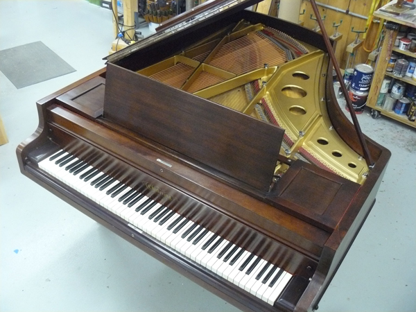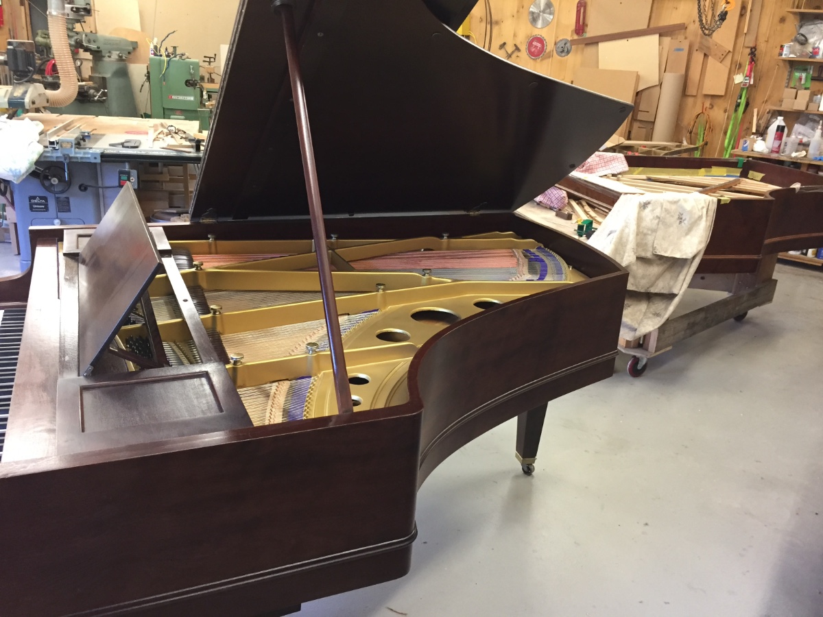 Soundboard had been replaced we suspect by the Chickering factory early 1900’s. The floating soundboard which was in the patent of the 106c had been previously removed. So the soundboard is a traditional perimeter glued assembly. Soundboard restored. New pin blocks, bridge caps. Paulello nickel plated plain wire, Paulello core copper wrapped strings and soft iron wraps in transition areas at the high bass. Ronsen Bacon felt hammers. Single offset keys fully restored, shimmed and spaced with Tharan mineral plastic keytops. Action replaced as we had not solved the obsolete parts problem yet and the hammer shank line needed too much work to be functional for the long haul. WNG composite parts configured in original flared design. Original leverage respected.